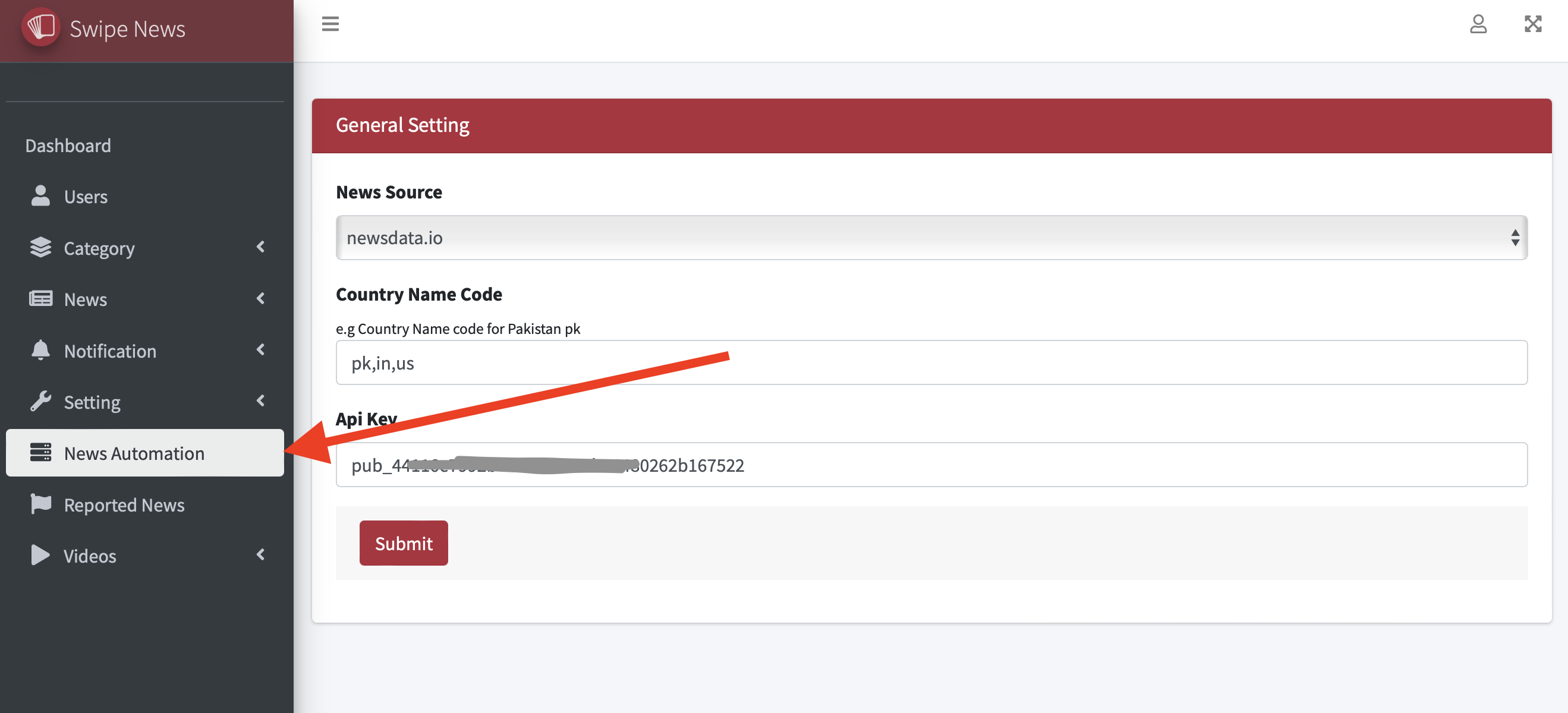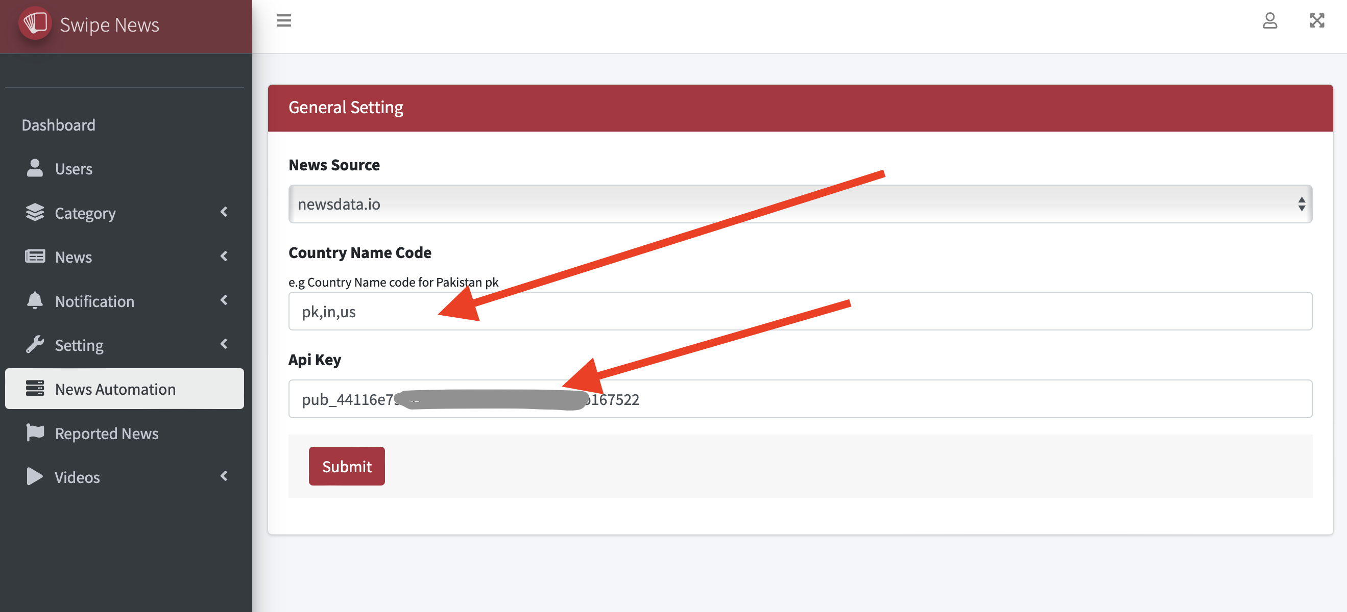 2. Add the countries name codes where you want to launch SwipeNews app and add API key